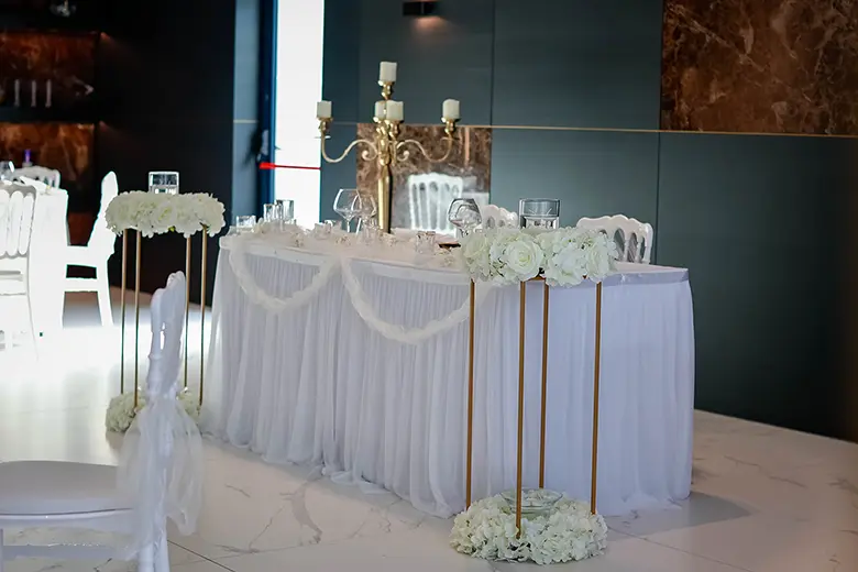 Personnaliser votre salle de réception ? Bien entendu, notre équipe se tient prête à vous écouter et à redécorer la salle en fonction de vos envies : nappage, coussins, chaises, buffets, équipement audiovisuel, etc.